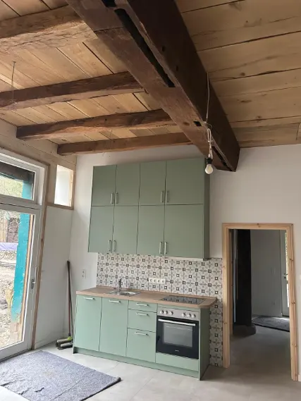 Der ehemalige Stallbereich wurde in zwei moderne Wohneinheiten verwandelt, in denen die alte Eichenkonstruktion komplett sichtbar blieb.