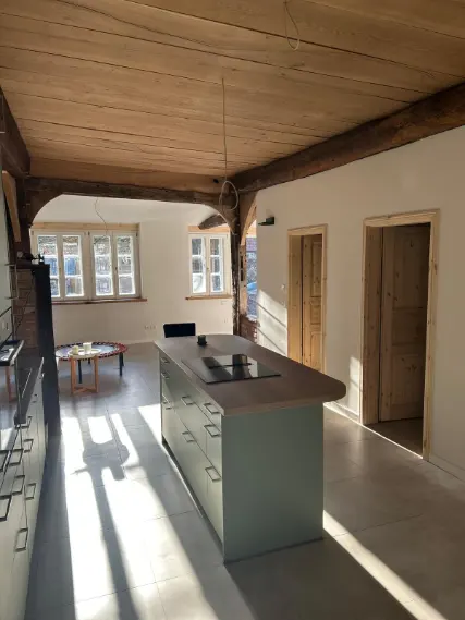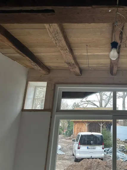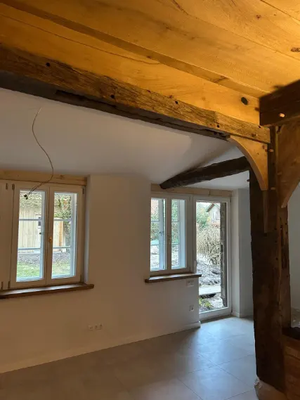 Neue Eichendecken und Innenwände ergänzen harmonisch die historische Substanz.